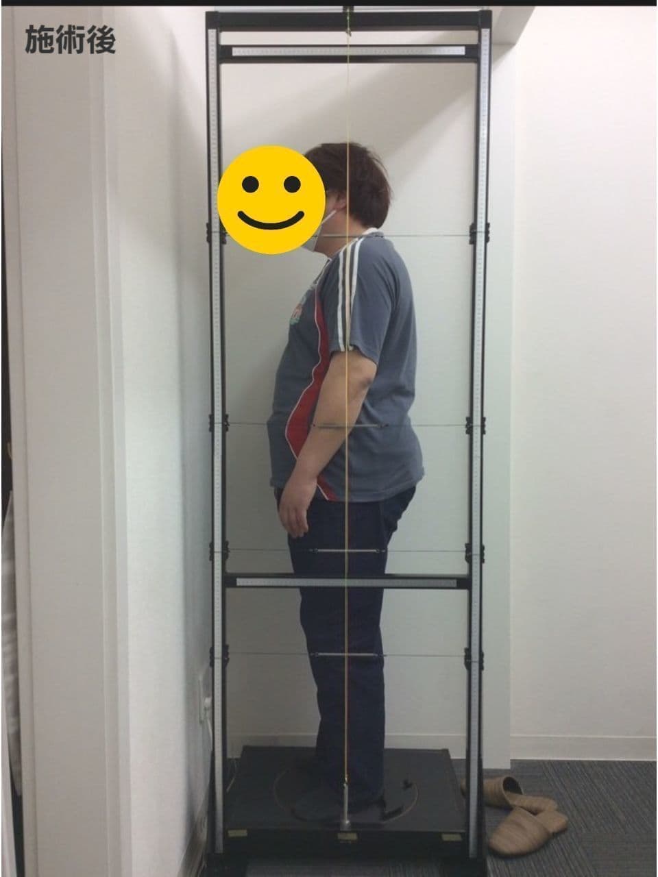 施術前は猫背が強く、背中が丸まりやすい状態でしたが、施術後に大幅に猫背が改善されました。