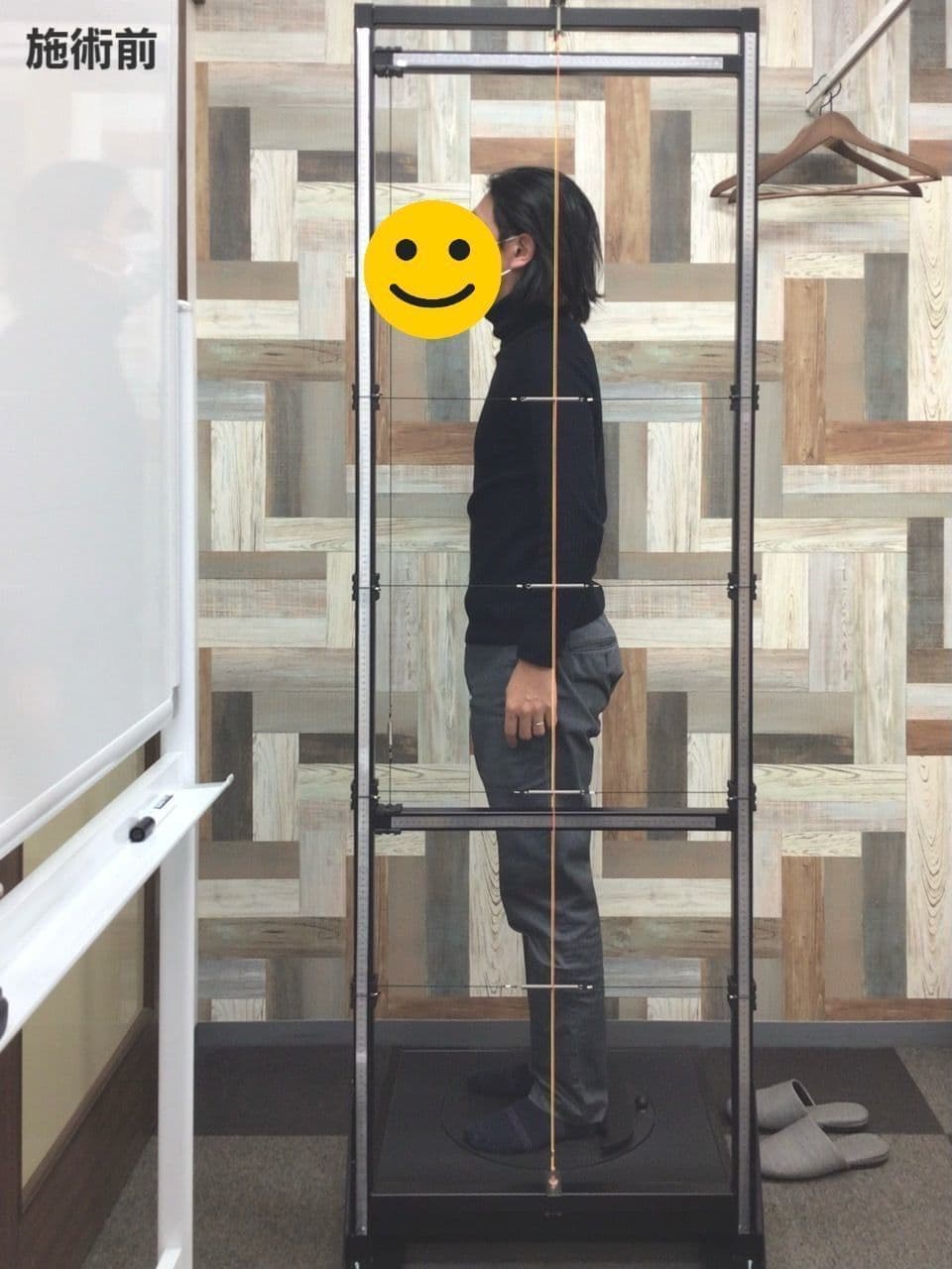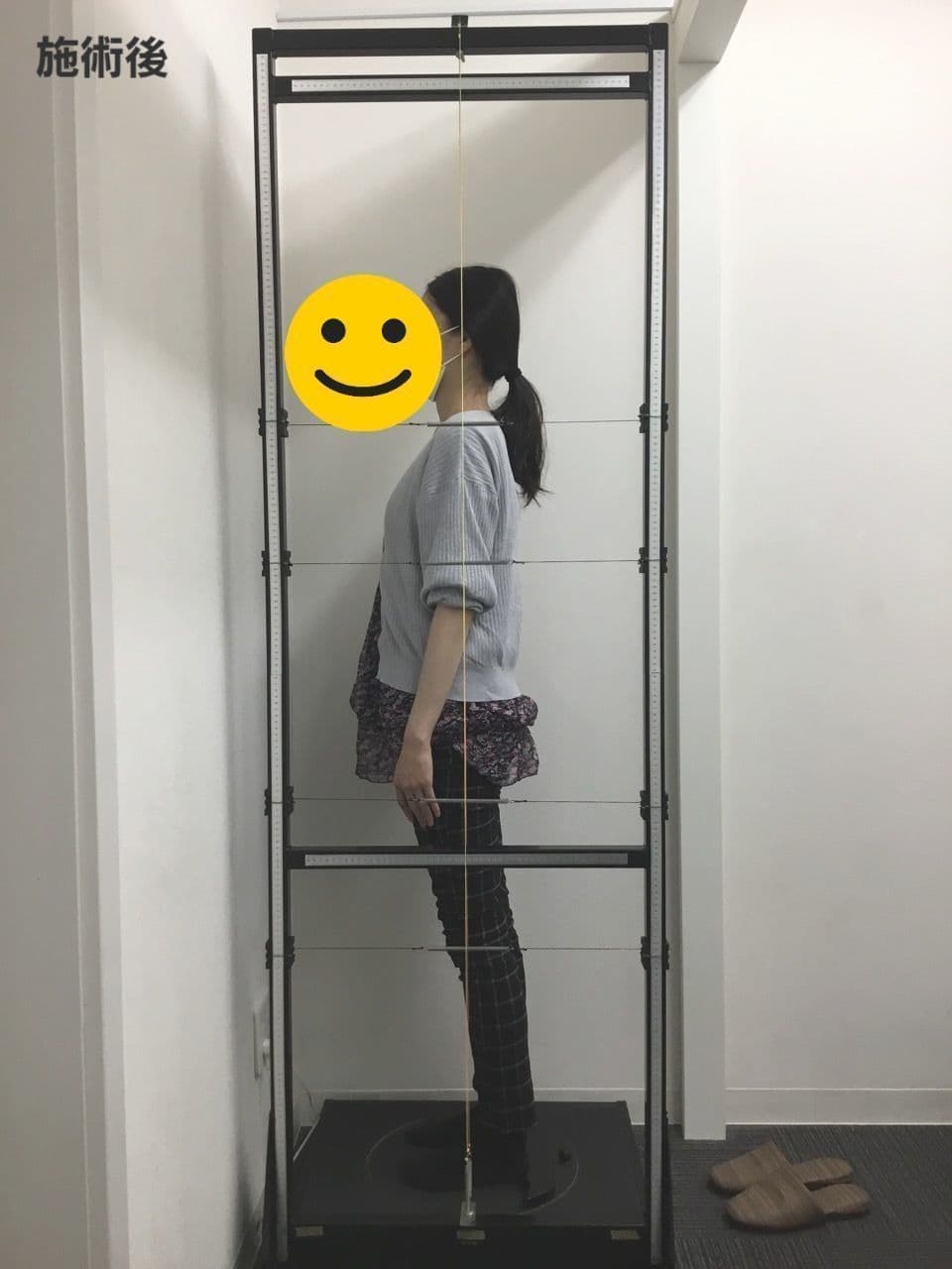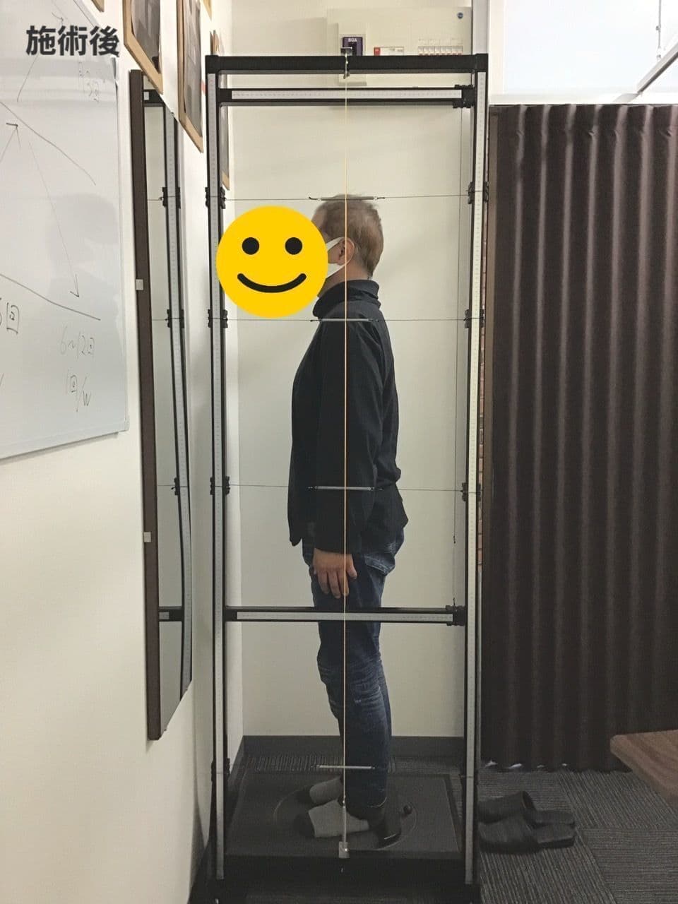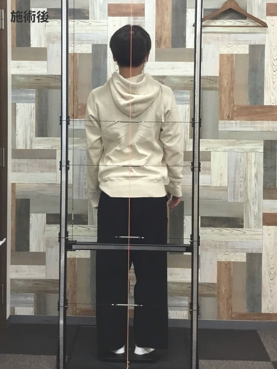 施術前は後ろ重心になっていましたが、施術後に安定した重心となり、姿勢が良くなりました。