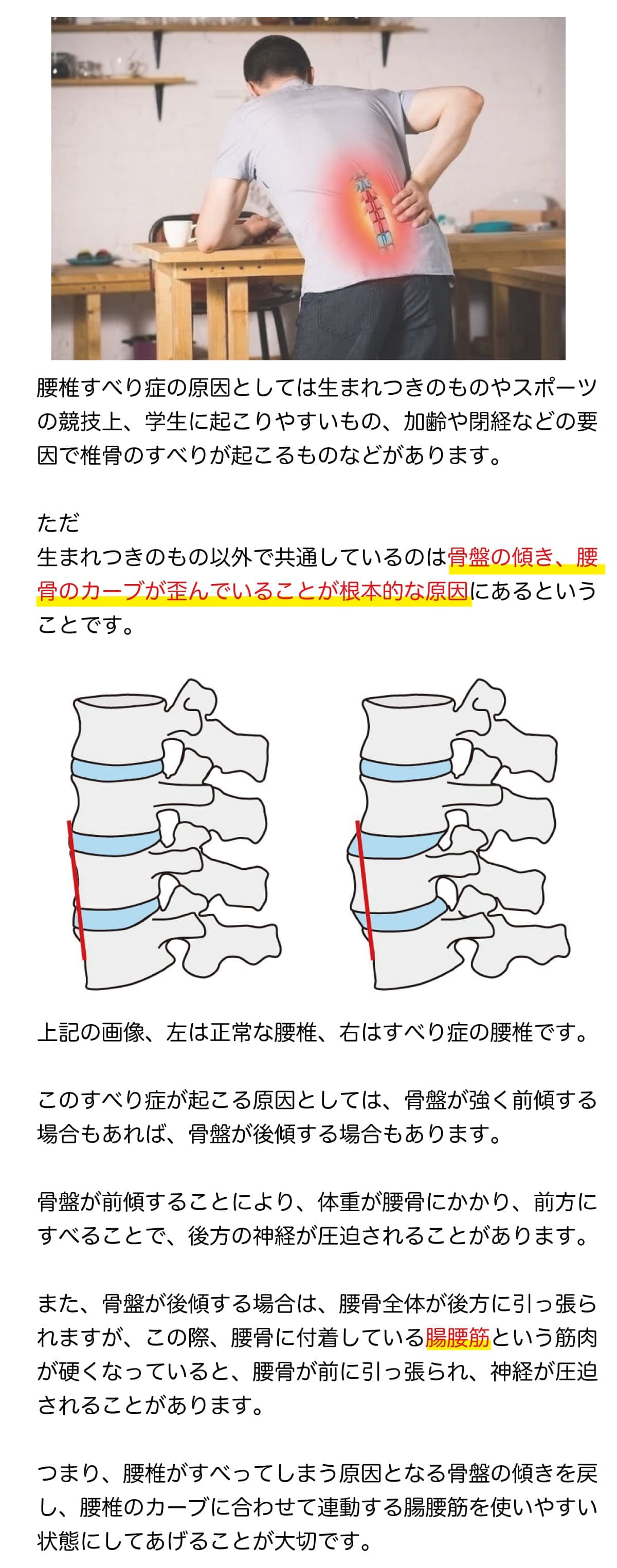 鎮痛剤やブロック注射で腰椎すべり症の症状が一時的に軽減しても、骨格の変形を治さなければ、これらの問題は再発する可能性が高いです。