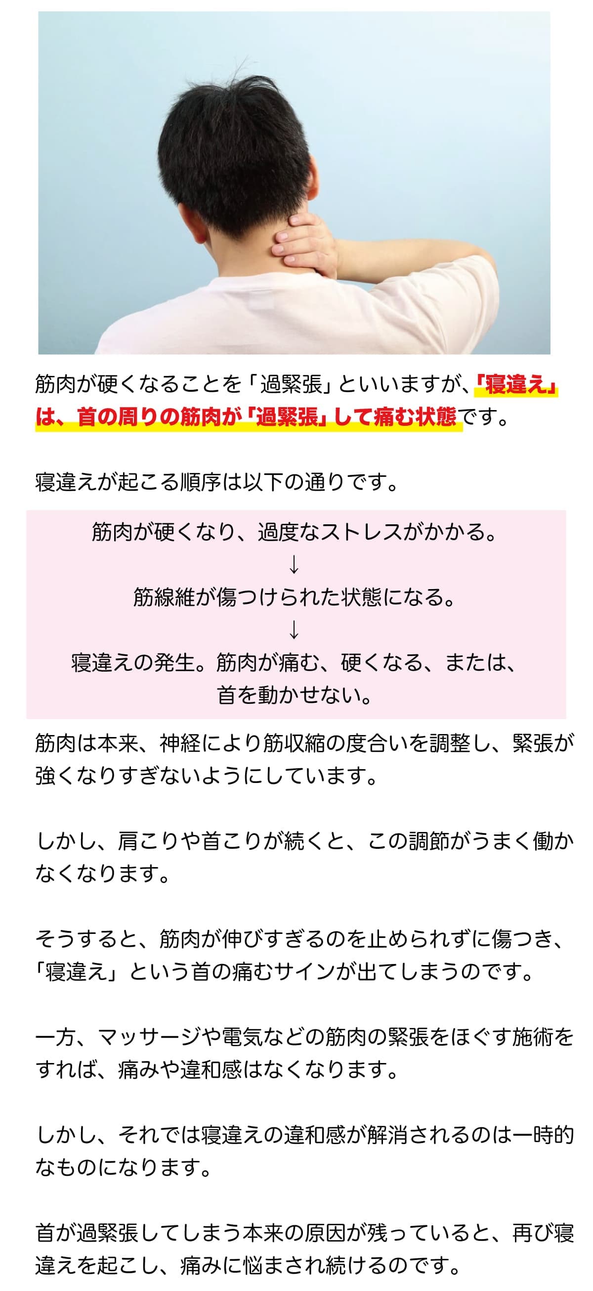 筋肉の使い過ぎによる筋肉の損傷は、寝違えの根本的な原因です。