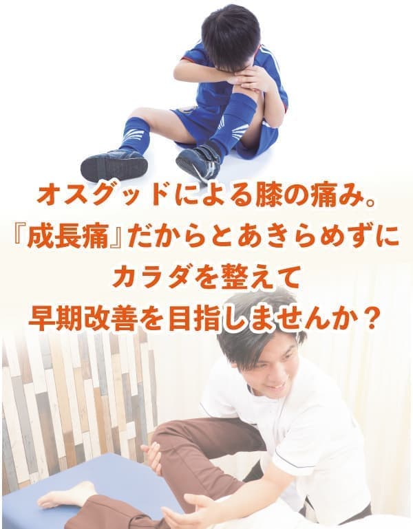 オスグッドの場合、骨盤がずれて前傾しているため、太ももの筋肉に負担がかかり、膝下の出っ張った骨を押して痛みを生じます。